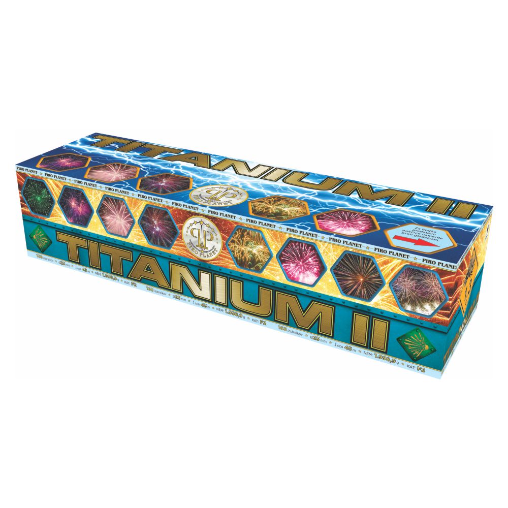 Titanium II je 168 strelna MEGA kobinacija ognjemetnih baterij. Titanium je silvestrski ognjemet, sestavljen iz 4 ognjemetnih baterij v zaporedju, ki stopnjuje silvestrsko razpoloženje do vrhunca. Idealna kombinacija za poroke in raznorazna slavja.